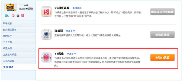 与YY娱乐星级公会签约后,如主播达到申请条件,可登录个人中心,在资格申请中提交申请。当前YY音乐社区开放偶像的申请时间为每月1号-20号。