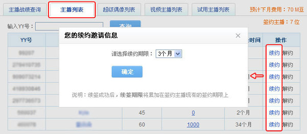 1、在签约主播管理中,向主播发出续约邀请: