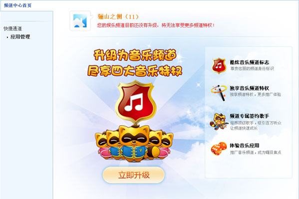 友情提示:由于音乐社区目前处于测试阶段,暂时需要通过论坛活动来获得升级音乐频道的权限,详情可留意论坛或咨询客服。